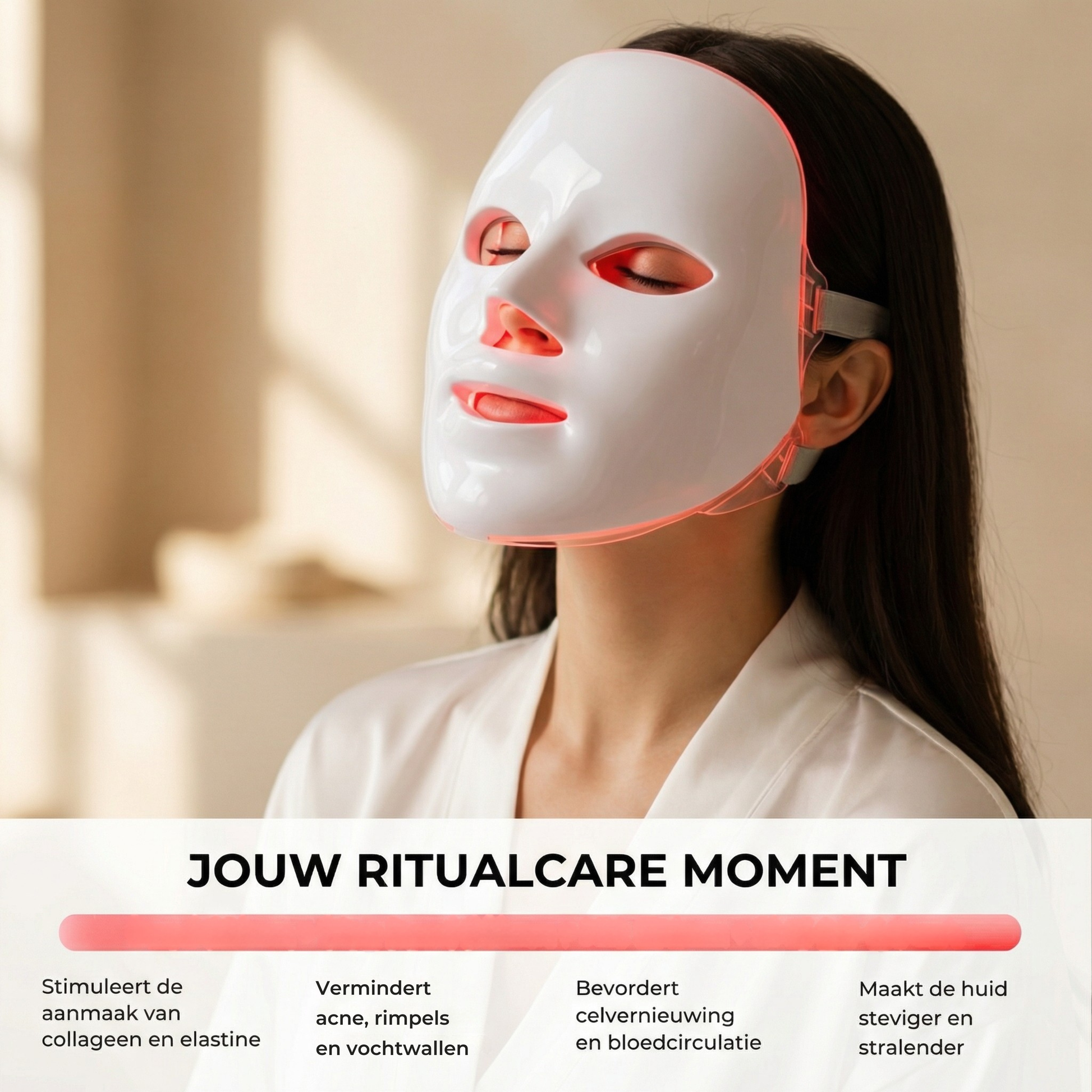 Nee. Het bevat geen UV, volledig veilig voor de huid en kent geen risico op verbranding of DNA-schade. Dit gezichtsmasker van Ritual Care is klinisch bewezen.